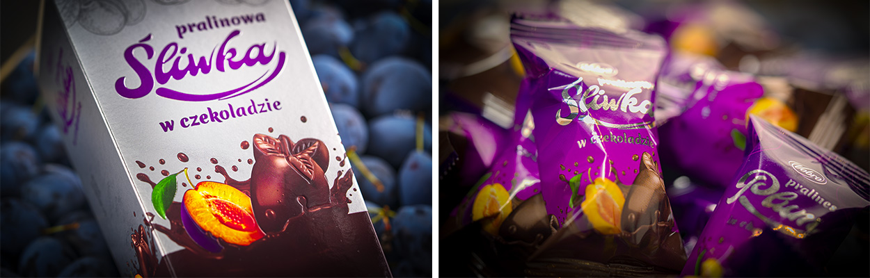praliny z wiśnią w alkoholu, podwójnie nadziewane cukierki czekoladowe, a także galaretki z kawałkami owoców.